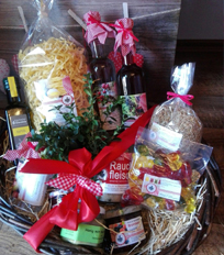 Unsere Produkte verpacken wir in handgeflochtenen Weidenkörben, rustikalen Holzkisten oder Taschen. Selbstverständlich können Sie auch einen Korb vorbeibringen, den wir Ihnen nach Ihren Wünschen füllen.